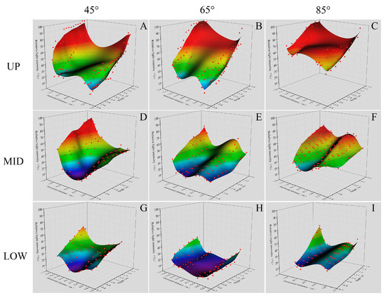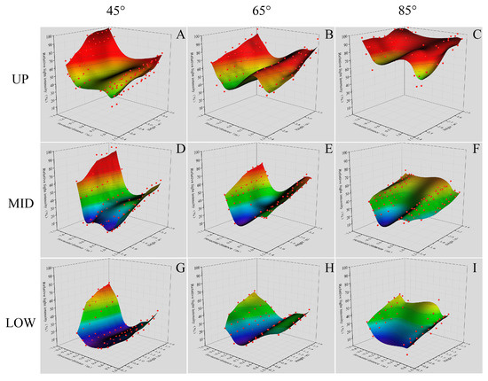 Three-dimensional distribution of the relative light intensity in the canopy of the peach trees at the end of the crown formation. UP ((A): 45°; (B): 65°; (C): 85°); MID ((D): 45°; (E): 65°; (F): 85°); LOW ((G): 45°; (H): 65°; (I): 85°).