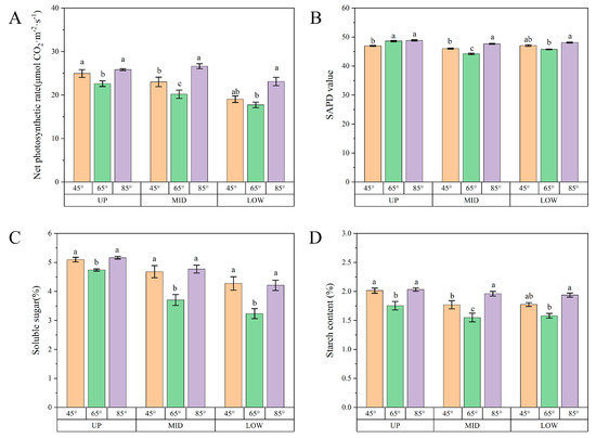 The influence of different opening angles on the photosynthetic rate can be effectively improved in the upper, middle, and lower parts of the canopy. In the middle of the canopy, the 85° angle photosynthetic rate was 26.63, which was 32.9% higher than that at 65° (Figure 7A). In Figure 7B, it can be seen that the chlorophyll SPAD values of leaves in different parts of the 85° canopy were significantly higher than those in the 65° and 85° treatments. In different parts of the canopy, the soluble sugar and starch contents of the leaves were 45° and 85°, which were significantly greater than those at 65°; there was no significant difference between 45° and 85°, and the overall trend was a gradual decrease from top to bottom (Figure 7C,D).