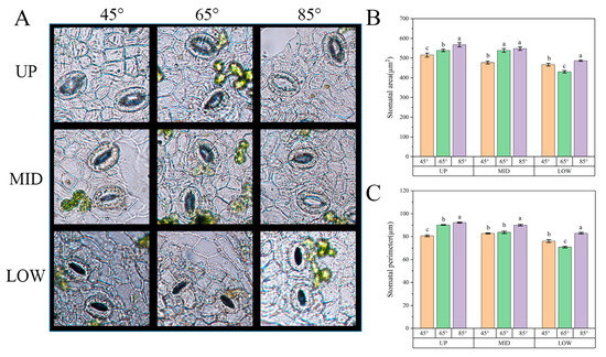 The morphology of the pores of leaves in the different parts of the canopy was examined under a microscope. As can be seen from the photos, the degree of opening of the pores in the upper canopy was greater than the degree of opening of the pores in the middle canopy, which was, in turn, greater than the degree of opening of the pores in the lower canopy (Figure 8A). The open distribution of pores from leaves in different parts of the canopy is generally consistent with the distribution of the relative light intensity in the canopy. As can be seen from Figure 8B,C, the circumference and area of the pores of the leaves in the middle and upper parts of the canopy followed the order 85° > 65° > 45°, but in the lower part of the canopy, the order was 85° > 45° > 65°.