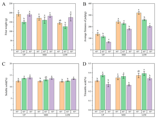 Effects of different main branch base angles on fruits quality in peach. (A) Friut weight; (B) average firmness of pulp; (C) soluble solid; (D) titratable acid. Different lowercase letters indicate significant differences between treatments (p < 0.05).