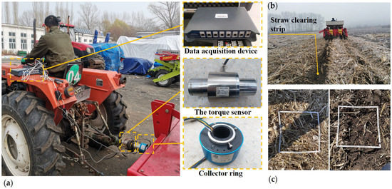 The connection of test instruments and equipment and the measurement of evaluation indexes. (a) The connection of power consumption measurement instruments and equipment. (b) Test environment and process. (c) Straw clearing rate measurement.