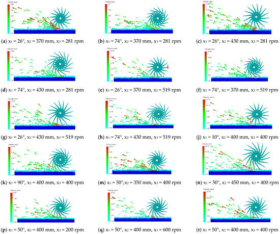 When the straw-clearing knife roller was all in a virtual soil trough in the axial direction and in a stable operational state, the velocity magnitude and position distribution of the straw lateral moving and throwing in a discrete element simulation test of different parameter combinations were shown in Figure 5. Under different parameter combination conditions, the trajectories of straw lateral moving and throwing had similar characteristics. Straw particles in the vertical direction were discrete distribution, and straw particle velocity gradually increased from the bottom to the top. The interaction time between the straw on the top and the lateral straw clearing and the throwing knife was longer; the straw would slip and accelerate with the rotation of the knife, so the time that the straw separated from the knife was late, and the speed was large, which was consistent with above theoretical analysis. However, at the same moment, there were differences in the movement trend and velocity magnitude of straw particle groups under different parameter combinations, in which the movement trend of the straw particle groups was mainly related to the edge angle of cutting of the knife. When the edge angle of cutting was large, the vertical directional velocity of straw particles was small, the throwing height was low, and the straw groups showed an approximately horizontal movement; when the edge angle of cutting was small, the vertical directional velocity of straw particles was large, the throwing height was high, and the straw groups showed a parabolic movement, as shown in Figure 5a,b. The movement velocity magnitude of a straw particle was mainly related to the rotation radius of the knife and the rotation speed of the knife roller. When the rotation radius of the knife was large, the throwing velocity of the straw particle was large, as shown in Figure 5b,d; and when the rotation speed of the knife roller was large, the throwing velocity of the straw particle was large, as shown in Figure 5b,f. When the rotation speed of the knife roller was greater than 281 rpm, the straw particles were thrown by the first two rows of lateral straw clearing and throwing knives in the forward direction of the straw clearing knife roller, while the last two rows of the lateral straw clearing and throwing knives had no straw to clear. When the rotation speed of the knife roller was not greater than 281 rpm, the four rows of lateral straw clearing and throwing knives on the straw clearing knife roller were all involved in the straw clearing.