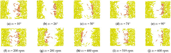 Straw-clearing effect graph of discrete element simulation test. (a–e) Straw-clearing effect graph of different values of the edge angle of cutting conditions when the rotation radius of the knife and the rotation speed of the knife roller were located at the design center point. (f–j) Straw-clearing effect graph of different values of the rotation speed of the knife roller conditions when the edge angle of cutting and the rotation radius of the knife were located at the design center point.