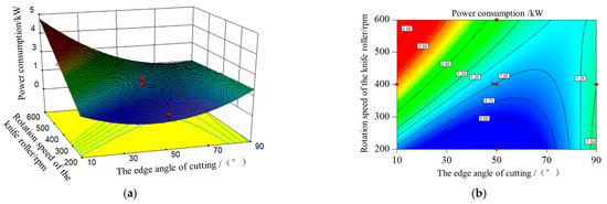 When the edge angle of cutting was not greater than 83°, power consumption increased with the increase of rotation speed of the knife roller. According to Equation (6), power consumption was proportional to the rotation speed of the knife roller and increased with the increase of rotation speed of the knife roller, which was consistent with the actual operation condition. When the edge angle of cutting was greater than 83°, power consumption decreased with the increase of rotation speed of the knife roller. This might be because when the edge angle of cutting was large, the main effect of the knife on the straw was slip cutting; most of the straw moved through the inertia effect of the knife. This performance was more significant when the rotation speed of the knife roller was higher; the actual work performed by the knife to clear the straw was less, which led to a decrease in power consumption.
