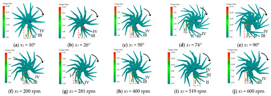 As shown in Figure 10f–j, when the rotation speed of the knife roller was less than 281 rpm, the torque of the straw-clearing knife roller was mainly transmitted through the first two rows of lateral straw clearing and throwing knives in the operating direction, and the force on the last two rows of lateral straw clearing and throwing knives was small. It indicated that when the rotation speed of the knife roller was low, under the condition that the existing circumferential knife number was unchanged, the knife numbers in the axial direction needed to be more to achieve straw clearing. When the rotation speed of the knife roller was relatively high, the axial length of the straw-clearing knife roller needed to be increased to increase the number of axial knives. This would not only increase manufacturing costs but also lead to an increase in the axial dimension of the device, which would have a negative influence on the operation, transport, and matched power of the machine. Therefore, under the condition that the operation performance is allowed, the design value of the rotation speed of the knife roller should be greater than 281 rpm.
