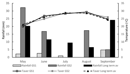 Monthly means of the mean (Taver) air temperatures (°C) and total rainfall (mm) for 2019 (GS1), 2020 (GS2) growing seasons, and the long-term 30-year average (1989–2018) at the experimental site.