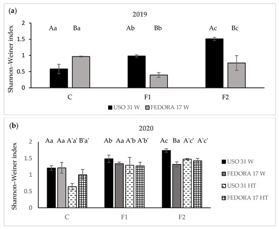 Shannon–Weiner index of weeds in hemp crop during the growing season 2019 (a) and during the growing season 2020 (b). Vertical bars indicate the standard errors of the means. Values without a common letter are statistically significant according to LSD (0.05).