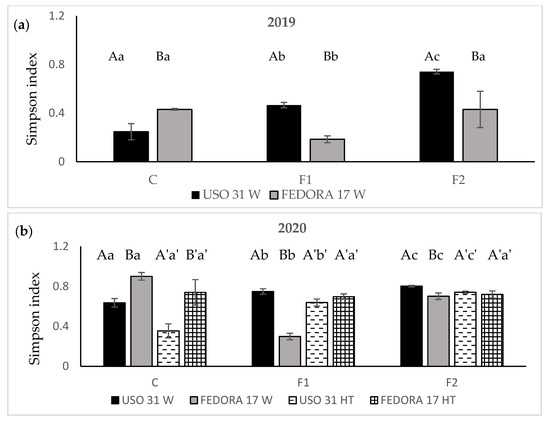 Simpson index of weeds in hemp crop during the growing season 2019 (a) and the growing season 2020 (b). Vertical bars indicate the standard errors of the means. Values without a common letter are statistically significant according to LSD (0.05).
