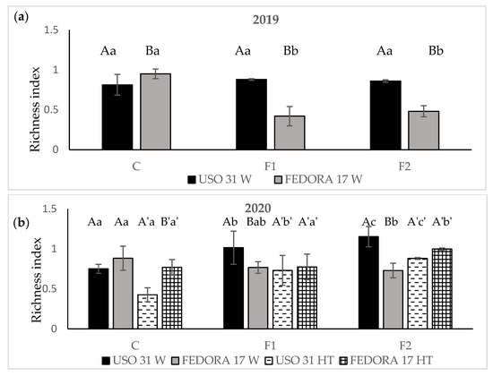 Concerning the first growing season, Richness index values were not significantly affected by the addition of fertilizer in the plots of the cultivar “Uso 31”. Moreover, the total number of weed species per sample included in plots of “Fedora 17” decreased by the fertilization treatments showing statistically significant differences compared with unfertilized plots (p < 0.05). Among cultivars, the values of the richness index were, in general, higher in the cultivar “Uso 31” (Figure 6a).