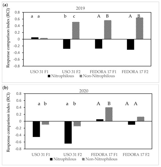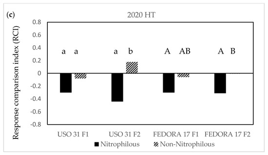 In weedy conditions, the RCI varied between the growing seasons, and it was lower in “Uso 31” for both nitrophilous and non-nitrophilous weeds under the two fertilization treatments. Among the weeds and fertilization, the lowest values were observed at the nitrophilous weeds of weedy “Uso 31” at 140 kg ha−1. Regarding the cultivar of “Fedora 17”, RCI values were higher than zero in weedy plots recording the highest values of 0.40 in non-nitrophilous weeds at 70 kg ha−1, whereas there was an opposite trend of nitrophilous weeds at the 140 kg ha−1 (Figure 7b). Herbicide application reduced the RCI values of nitrophilous and non-nitrophilous below zero in all cultivars and fertilization treatments except for the non-nitrophilous weeds in plots of “Uso 31” at 140 kg ha−1. Among cultivars, the lowest RCI values were recorded in the nitrophilous weeds at the maximum rate of fertilizer (Figure 7c).