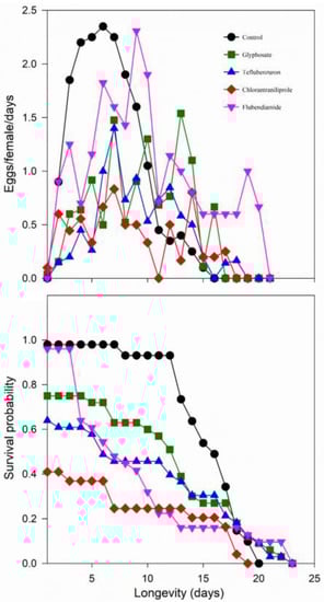 The mean fecundity differed in females exposed to chlorantraniliprole, teflubenzuron, and glyphosate from those exposed to flubendiamide and control (χ2 = 31.9; df = 4, p = < 0.001). However, no significant differences among treatments were observed in daily oviposition (χ2 = 6.5; df = 4; p = 0.164) (Table 4).