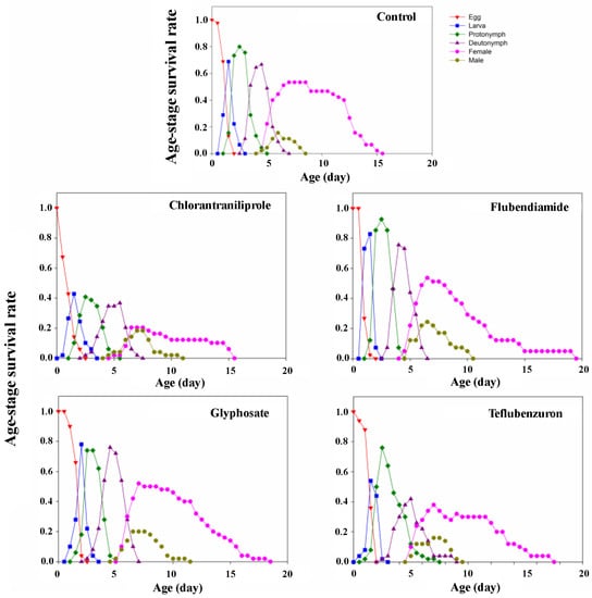 The probability of emergence/hatching and survivability of each of the stages of N. idaeus after contact with pesticides was estimated by the age–stage survival rate (Sxj), which represents the probability of a newborn individual surviving to age x at stage j (Figure 2).