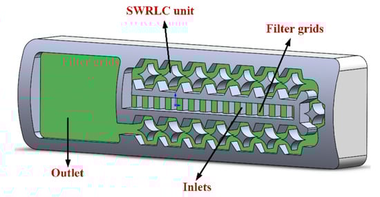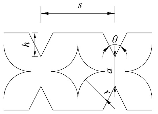 For increasing the diversity of flow channel cross-sectional structure types and the generation of head loss, a new type of stellate water-retaining labyrinth channel (SWRLC) structure was proposed and designed in this study. The SWRLC unit was composed of a stellate water-retaining structure and two symmetrical isosceles trapezoid structures without baselines [35]. The characteristics and parameters of the SWRLC unit are shown in Figure 1. The three-dimensional model of the SWRLC emitter is shown in Figure 2. Therefore, each emitter was characterized by its structural design in terms of the key parameters of length of the trapezoid baseline (s), angle between the hypotenuses of adjacent trapezoids (), trapezoid height (h), radius of stellate water-retaining structure (r), and spacing of two symmetric trapezoids (a), as well as path depth (d) and SWRLC unit number (n). Generally, the discharge of the emitter is required to be less than or equal to 12 L/h. The range of the crucial geometric parameters was selected in light of design requirements and discharge rules of emitters. The key design parameters of emitters are provided in Table 1.