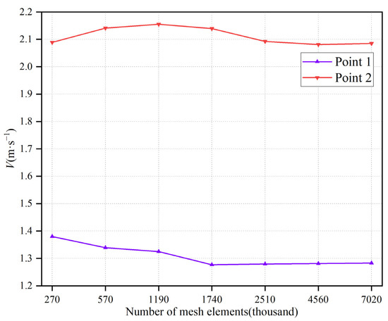 The independence of the meshing was performed to verify the reliability of the realizable k − ε model simulation results. The velocities of point 1 (coordinates were mm, mm, mm) and point 2 (coordinates were mm, mm, mm) for different mesh elements are shown in Figure 3. The results of the mesh independence study showed that the change in velocity was minor when the mesh cell number was at least . It is considered that the influence of mesh can be ignored at this point. Therefore, the mesh cell numbers for the realizable k − ε model were selected as . In that way, the accuracy of simulation result was not dependent on meshing.