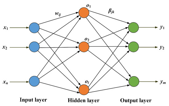 An ELM is a single-hidden layer feedforward neural network (SLFNN). The structure of an ELM is similar to that of a BPNN with a single hidden layer (Figure 4). Generally, we set the input matrix X and output matrix Y of the training set with Q samples as follows: