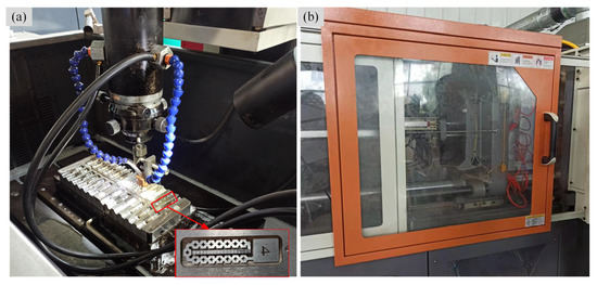 The manufacturing processes of the SWRLC emitter: (a) mold manufacturing by EDM; (b) injection molding production.