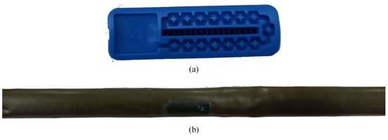 To examine the reliability of CFD simulated data, a set of key parameter combinations of the SWRLC emitter was randomly selected and manufactured by EDM technology and the IM method. SWRLC emitters selected the drip belts with a 16 mm inner diameter and 0.3 mm wall thickness. The distance between SWRLC emitters on drip belts was 40 cm. The physical models of the SWRLC emitter and drip belts are shown in Figure 7.
