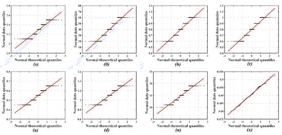 Among all of the parameters, the θ and a showed the maximum and minimum mean values of 39.7778 and 0.5481, respectively. θ and x showed the maximum and minimum standard deviation (SD) values of 14.0078 and 0.0049, respectively. Since the units and mean values of all of the parameters were different, coefficient of variation (CV) was used instead of standard deviation to measure the degree of variation. It can be seen from Table 2 that θ had highest data deviation (35.22) from the mean values, followed by n (19.57). Since the mean values and CV values of some parameters were very different, the dataset was normalized before model training so that its characteristics were all of the same order of magnitude. This was beneficial to improve the predictive accuracy of the model and shorten the training time. Nonetheless, the severely skewed data distribution indicates that the data is abnormal and may affect the predictive performance of the machine learning model. Skewness is a numerical characteristic of the asymmetrical degree of the data distribution. Generally, the skewness is between −0.5 and 0.5, indicating that the data is approximating symmetry. Table 3 showed that all the input parameters had a positively skewed distribution, and the output parameter (the flow regime index) had a negatively skewed distribution. The s and a showed the maximum and minimum skewness values of 0.1417 and −0.0202, respectively. The skewness values of all parameters were in the range of −0.5 to 0.5, which indicated that the data distribution was approximating symmetry. In order to intuitively check the data distribution of each parameter, the quantile–quantile plots of seven input variables and an output variable are shown in Figure 8. It is obvious that the dataset had a normal distribution based on the results of the quantile–quantile plots. In addition, the values of the skewness and kurtosis for each parameter were small.