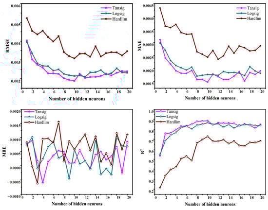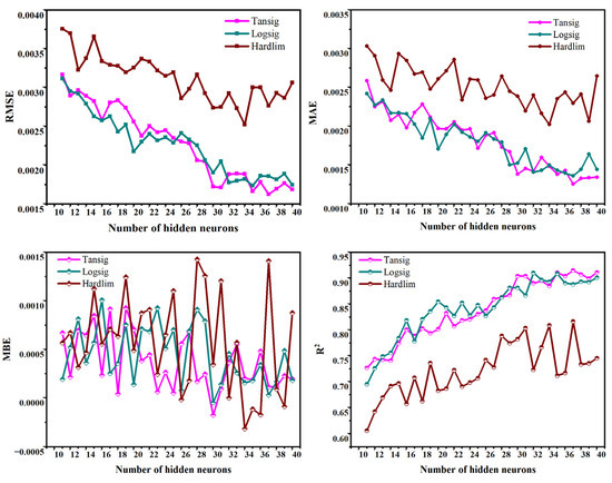 Statistical performance of the BPNN model with different transfer functions and hidden neurons in the testing stage.