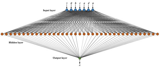 The influences of different transfer functions and the number of neurons in hidden layer on ELM model were also studied in order to determine the optimal model structure. In the training process, when the number of neurons in the hidden layer ranges from 1 to 10, the model gave a poor x prediction (the values of RMSE and MAE were too large, the value of MBE was too far from 0, and the value of R2 was too small). Figure 11 demonstrated that increasing the number of hidden layer neurons from 10 to 40 generated a conspicuous improvement in ELM model performance using 3 functions for x. The Tansig function performed best among the three activation functions. The values of RMSE and MAE were firstly decreased and then increased with the rise in the number of hidden layer neurons. The value of RBE oscillated around zero and the value of R2 firstly increased and then decreased as the number of hidden neurons increased. In particular, the value of CI was (the lowest) when the number of neurons in the hidden layer was 37 and the Tansig function was used. The RMSE and MAE at this point were 0.00163 and 0.00126, respectively. The MBE and R2 were and 91.49%, respectively. Therefore, the most appropriate ELM model structure was 7–37–1 (input neurons, hidden neurons, and output neuron, respectively), which gave the best performance for predicting flow regime index x. The proposed ELM model structure is shown in Figure 12.