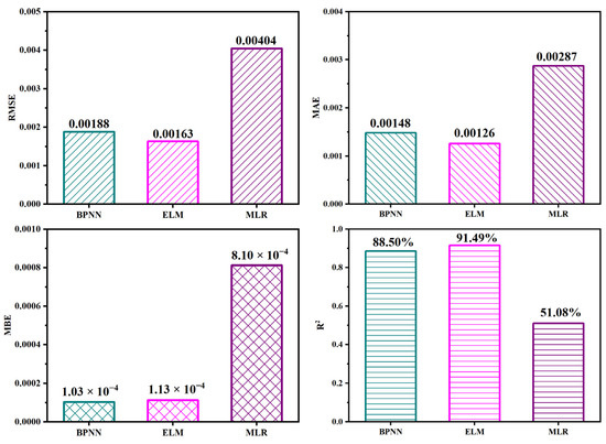 Figure 13 indicated that ELM model with the lowest RMSE and MAE values (0.00163 and 0.00126, respectively) and highest R2 value (91.49%) performed better than the others. The MBE value ranked the BPNN model performance (1.03 × 10−4) as excellent followed by ELM model. It is testified that different assessment indices may bring about a different evaluation result of model performance since each assessment indicator had a specific evaluation level. The choice of model with best performance based on the different assessment indicator was not a responsible method.