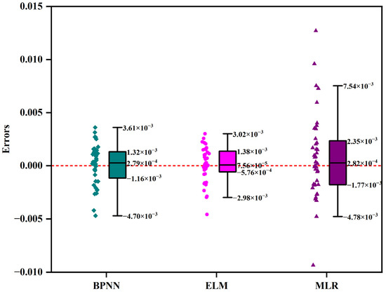 Next, the errors that equaled differences between the predicted and observed values were compared, as shown in Figure 15. The distribution in Figure 15 showed that the errors of the three models were concentrated around zero. The median value of the ELM model was 0.00008, which was lower than the BPNN (Q2 = 0.00028) and MLR (Q2 = 0.00028). This indicated that the average level of ELM error was closer to 0. In other words, the predicted values of the ELM were closer to the observed values. The interquartile range (IQR) for ELM, BPNN, and MLR were 0.00196, 0.00248, and 0.00412, respectively. In the lower quartile, the ELM with Q1 = −0.00058 performed better than BPNN (Q1 = −0.00116) and MLR (Q1 = −0.00177). Additionally, the upper quartile in BPNN (Q3 = 0.00132) was lowest, followed by ELM with a slight difference (△Q3 = 0.00006). Figure 14 showed that the lower and upper edge values in the ELM model (−0.00298 and 0.00302, respectively) were lower than in the BPNN model (−0.0047 and 0.00361, respectively) and the MLR model (−0.00478 and 0.00754, respectively), confirming the ability of the ELM model to predict flow regime index x.