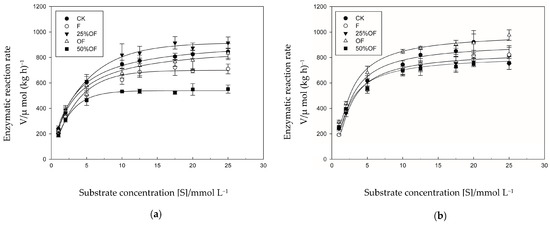 Curve of enzymatic reaction rate of β–glucosidase versus substrate concentration on jointing stage (a) and booting stage (b) of spring wheat. Data represent mean ± SD (n = 3). CK indicates no fertilizer treatment. F indicates single fertilizer treatment. 25% OF indicates 25% organic fertilizer plus 75% chemical fertilizer treatment. OF indicates organic fertilizer treatment. 50% OF indicates 50% organic fertilizer plus 50% chemical fertilizer treatment.