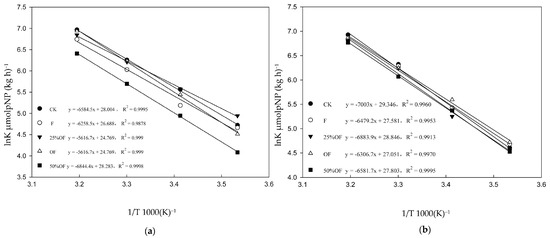 Temperature is also an important factor affecting change in the enzymatic reaction rate. According to the temperature response curve of soil β–glucosidase, it can be seen from Figure 2 that there was a linear positive correlation between lnK and T among the different treatments at the jointing and booting stages of wheat. At the same substrate concentration, β–glucosidase activity in the soil of each treatment gradually increased with an increasing culture temperature in the temperature range of 10~40 °C.