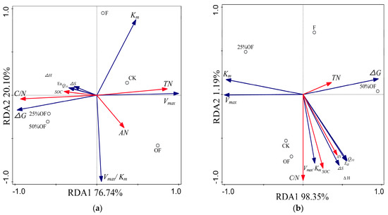 Redundancy Analysis (RDA) of relationships between soil properties and kinetic and thermodynamic parameters of soil β–glucosidase at the jointing stage (a) and booting stage (b) of spring wheat. Note: TN total nitrogen; AN alkali–hydrolyzable nitrogen; SOC organic carbon; C/N ratio of carbon to nitrogen.