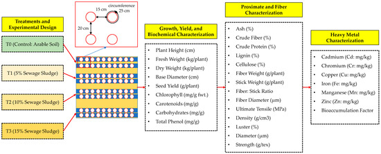Previously, no study has reported the use of SS for the cultivation of S. bispinosa. Keeping in view the aforementioned points, applying SS to a S. bispinosa crop could improve the soil’s fertility and provide a sustainable source of nutrients for the crop. Thus, the objective of this study was to evaluate the potential of using SS as a fertilizer for S. bispinosa crop production. The research also assessed the impact of applying SS on plant growth, yield, biochemical traits, and heavy metal accumulation through the proximate and quality characterization of the obtained S. bispinosa fibers. According to the findings of this study, a sustainable method for producing high-quality S. bispinosa fiber and fertilizing the soil effectively could reduce the environmental pollution brought on by improper disposal of SS. Therefore, the study may provide valuable information on the sustainable management of SS, the potential use of fiber plants as phytoremediation tools, and the characterization of the properties of the fibers of a lesser-known plant. The combination of these factors makes this research innovative and relevant to sustainable waste management.