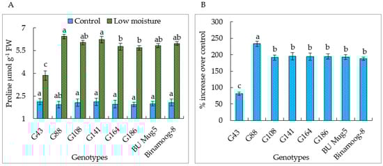 Proline content (A) and (%) increase over control (B) in leaf of mungbean genotypes under low soil moisture conditions. The vertical bar indicates an average of five independent replicates (n = 5). Error bars represent standard error. Different letters indicate significant differences at p ≤ 0.05.
