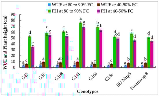 Relationship between water use efficiency and plant height of different mungbean genotypes. The vertical bar indicates an average of five independent replicates (n = 5). Error bars represent standard error. Different letters indicate significant differences at p ≤ 0.05.