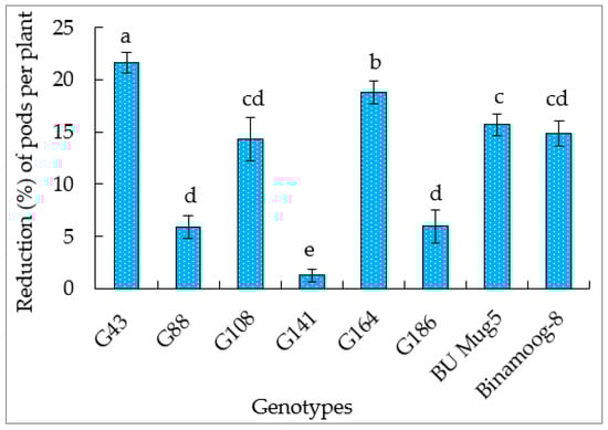 Reduction (%) in pods per plant of mungbean genotypes under low soil moisture condition. The vertical bar indicates an average of five independent replicates (n = 5). Error bars represent standard error. Different letters indicate significant differences at p ≤ 0.05.