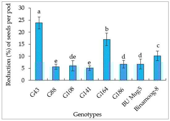 Reduction (%) of seeds per pod of mungbean genotypes under low soil moisture condition. The vertical bar indicates an average of five independent replicates (n = 5). Error bars represent standard error. Different letters indicate significant differences at p ≤ 0.05.