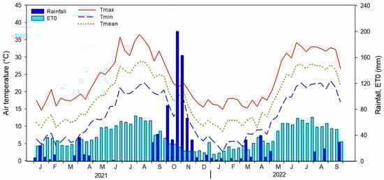 Meteorological course (air temperature, rainfall, and reference evapotranspiration–ET0) recorded during the 2-year period (2021–2022) at the experimental farm of the University of Catania, Italy (10 m a.s.l., 37°25′ N lat., 15°03′ E long.).