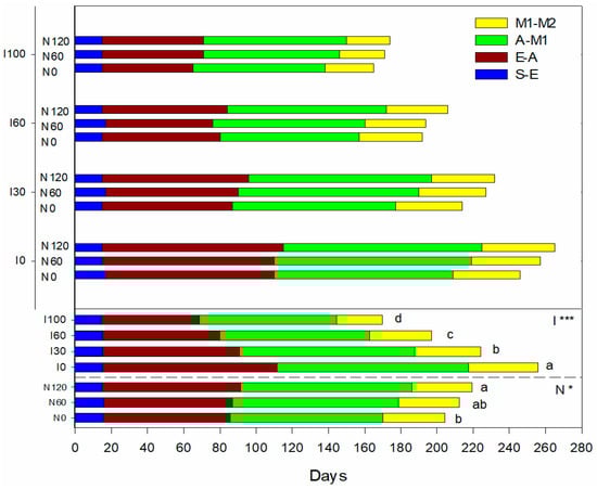 Length of phenological stages in castor (sowing–emergence (S-E), emergence–anthesis (E-A), anthesis–physiological maturation of the primary racemes (A-M1), and maturation of the primary racemes–maturation of secondary racemes (M1–M2)) in relation to irrigation (I0, I30, I60, and I100% = 0, 30, 60, 100% ETm restoration, respectively) and N fertilization (N0, N60, and N120 = 0, 60, and 120 kg ha−1 of N, respectively). The lower part shows the mean separation of the total phenological stage length, with different letters representing statistically significant means according to the LSD test (p ≤ 0.05). The significance levels of ANOVA for irrigation (*** significant at p ≤ 0.001) and N fertilization (* significant at p ≤ 0.05) are shown. The interaction I × N is not significant.
