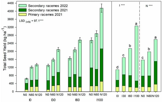 On the left, the total seed yield (kg ha−1) (primary and secondary racemes from 2021 and 2022) in relation to irrigation (I0, I30, I60, and I00 = 0, 30, 60, and 100% ETm, respectively) and N fertilization (N0, N60, and N120 = 0, 60, and 120 kg ha−1 N) with error bars indicating the standard error. On the right, there is the mean separation of the total seed yield, with different letters representing statistically significant means according to the LSD test (p ≤ 0.05). The significance levels of the ANOVA for irrigation and N fertilization (*** significant at p ≤ 0.001) and the significant interaction (LSDI×N at p ≤ 0.05) are shown.