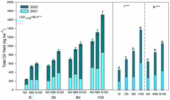 On the left, the total oil yield (kg ha−1) of the two years (2021 and 2022) in relation to irrigation (I0, I30, I60, and I00 = 0, 30, 60, and 100% ETm, respectively) and N fertilization (N0, N60, and N120 = 0, 60, and 120 kg ha−1 N), with error bars indicating the standard error. On the right, there is the mean separation of the total oil yield, with different letters representing statistically significant means according to the LSD test (p ≤ 0.05). The significance levels of the ANOVA for irrigation and N fertilization (*** significant at p ≤ 0.001) and a significant interaction (LSDI×N at p ≤ 0.05) are shown.