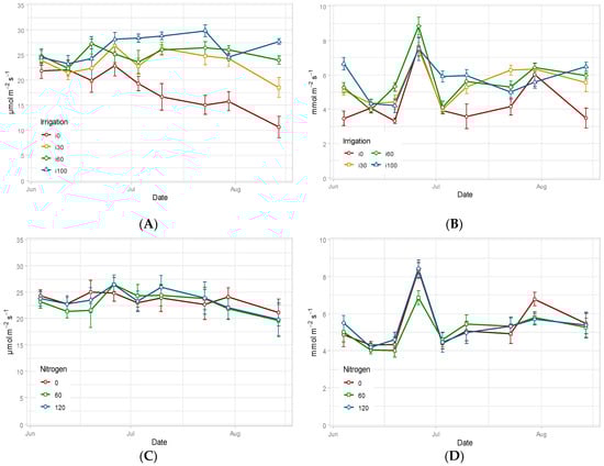 (A) Net photosynthesis (µmol CO2 m−2 s−1) according to the irrigation level and (C) nitrogen fertilization levels. (B) Transpiration rate (mmol H2O m−2 s−1) according to the irrigation level and (D) nitrogen fertilization levels.