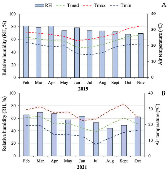 Maximum (Tmax), minimum (Tmin), and average (Tmed) air temperature (°C) and relative humidity (RH, %) inside a semi-climatized greenhouse at the Instituto de Desenvolvimento Rural do Paraná-IAPAR/Emater, Londrina, PR, Brazil, from February to November 2019 (A) and February to October 2021 (B).