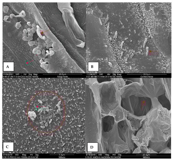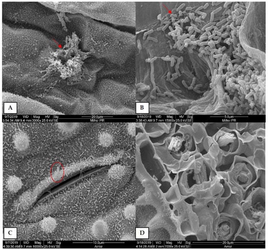 In rice, the presence of bacterial cells around the stomata was detected (Figure 5C); however, it was not possible to visualize the colonization of Xvv in the intercellular spaces in the fractures (Figure 5D). In sorghum (Figure 6A) and rye (Figure 6B), even when asymptomatic, it was possible to observe slight colonization of Xvv on leaf surfaces, in agreement with the results of the epiphytic survival of the bacteria verified for these species (Table 1). In millet, the morphology of bacterial cells was altered (Figure 6C), indicating possible cell death. Bacterial colonization of the mesophyll in these tissues was not observed during fracture examinations (Figure 6D). This suggests that millet is the only evaluated species on which Xvv can survive epiphytically (Table 1).