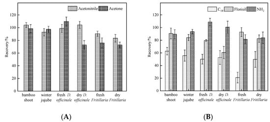 Effects of (A) type of extraction sorbent and (B) type of solid-phase extraction cartridge used in the recovery of imidacloprid from the bamboo shoot, winter jujube, fresh and dry D. officinale, and fresh and dry Fritillaria samples spiked at 0.1 mg·kg−1 (n = 3).