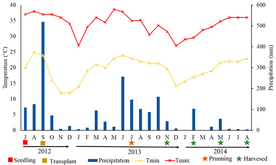 Weather conditions during the 26 months of the experiment are shown in Figure 1. September of the first year had a remarkably high rainfall compared with all other months of the study, primarily due to the occurrence of a hurricane, while January and March were completely dry. Mean maximum and minimum temperatures for the period were 27 to 39 °C and 12 to 25 °C, respectively. May was the hottest month (39 °C) and December was the coldest month (12 °C).