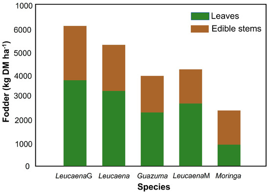 Estimated total fodder production by Leucaena–Guazuma mixture was always higher compered with the other species, except for the second pruning (February), when the Leucaena monocrop had a greater production. In contrast, the Moringa monocrop always had the lowest production, below 500 kg ha−1 per pruning (Table 5). It is interesting to note that most of the total biomass yield was in the form of leaves and edible stems, with very little woody material recorded in the first harnessing (after four months of the first pruning). It is also important to mention that 60–68% of the fodder biomass was made up of leaves (Figure 2). Among the mixed treatments, Leucaena (G) had the largest production (6133 kg ha−1 year−1) with 60% in the form of leaves, and the mixture formed by Leucaena–Moringa showed an intermediate production (3926 kg ha−1 year−1) with 61% in the form of leaves (Figure 2).