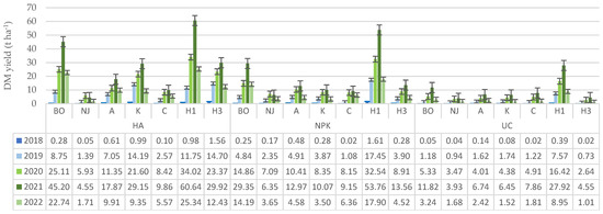 According to the treatments, the highest DM yield of 13.69 t ha−1 was found under HA, while 9.19 t ha−1 was found under NPK, and the lowest DM yield was 4.19 t ha−1 found under UC. However, although that treatment order was typical in general, it was not valid across all the years of the study and cultivars tested.