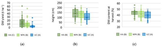 Box plot for DM yield (a), crop height (b), and DM content at harvest (c) according to the treatments HA, NPK, and UC, displaying the minimum, first quartile, median, mean, third quartile, and maximum. The letters A-B-C indicate homogeneous groups according to the MANOVA procedure for main effects at a 0.05 significance level.
