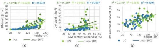 The linear course of dependence of dry matter yield on crop height (a), dry matter yield on dry matter content (b), and dry matter content on crop height (c) according to treatments HA, NPK, and UC.