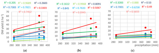 The crop growth and phytomass yield, respectively, were strongly affected by years (Table 7), especially when considering the comparable three full-production years (2020–2022). Although the weather of 2020–2022 was typical for the continental moderate climate, it also varied by year (Table 4). Therefore, the linear course of the yield dependence on weather conditions is displayed in Figure 6, and the relations are presented according to treatment and cultivars. There is evidence of the positive effect of the sum of precipitation increasing (R2 0.612) and the negative effect of average day temperature increasing (R2 0.721) relative to the crop yield increase, in general. According to treatment, the average reliability index of the relations was similar (0.577—0.668—0.590 R2 in the order HA—NPK—UC, respectively concerning the precipitations, and 0.676—0.765—0.721 R2, respectively, concerning temperature). From this analysis, it follows that the decisive factor that influences increases in yield was sufficient precipitation; a lack of precipitation was a limiting factor.