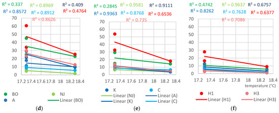 The linear course of dependence of dry matter yield on precipitation (a–c) and air temperature (d–f) according to treatments HA (a,d), NPK (b,e), and UC (c,f).