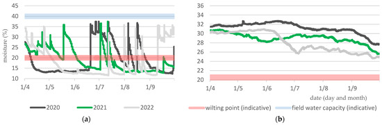 The time development of soil moisture (hour records) in full-production years at depths of 20 cm (a) and 50 cm (b). Data supplemented with the hydro-limit of field water capacity and wilting point (40 and 20%, respectively, ranging from 35 to 46 and 17 to 23%, respectively in clay-loamy, heavy soils).